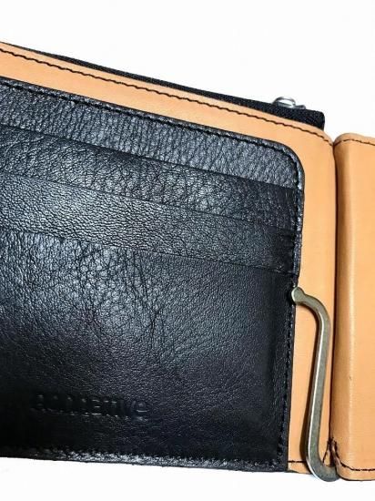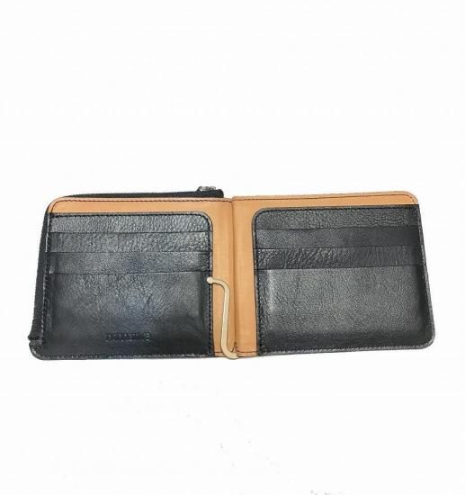 カウレザーを使用したマネークリップ付きの二つ折りウォレット。