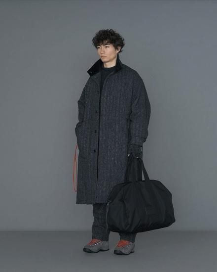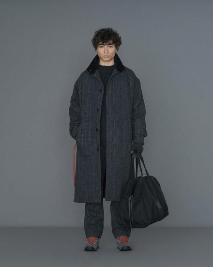 温かみのある表情のウールヘリンボーン素材を使用したバルマカーンタイプのロングコート。やや肩が落ちるリラックスシルエット。襟と袖口裏がコーデュロイ仕様のデザインが特徴で中綿を入れることで保温性にも優れている。
